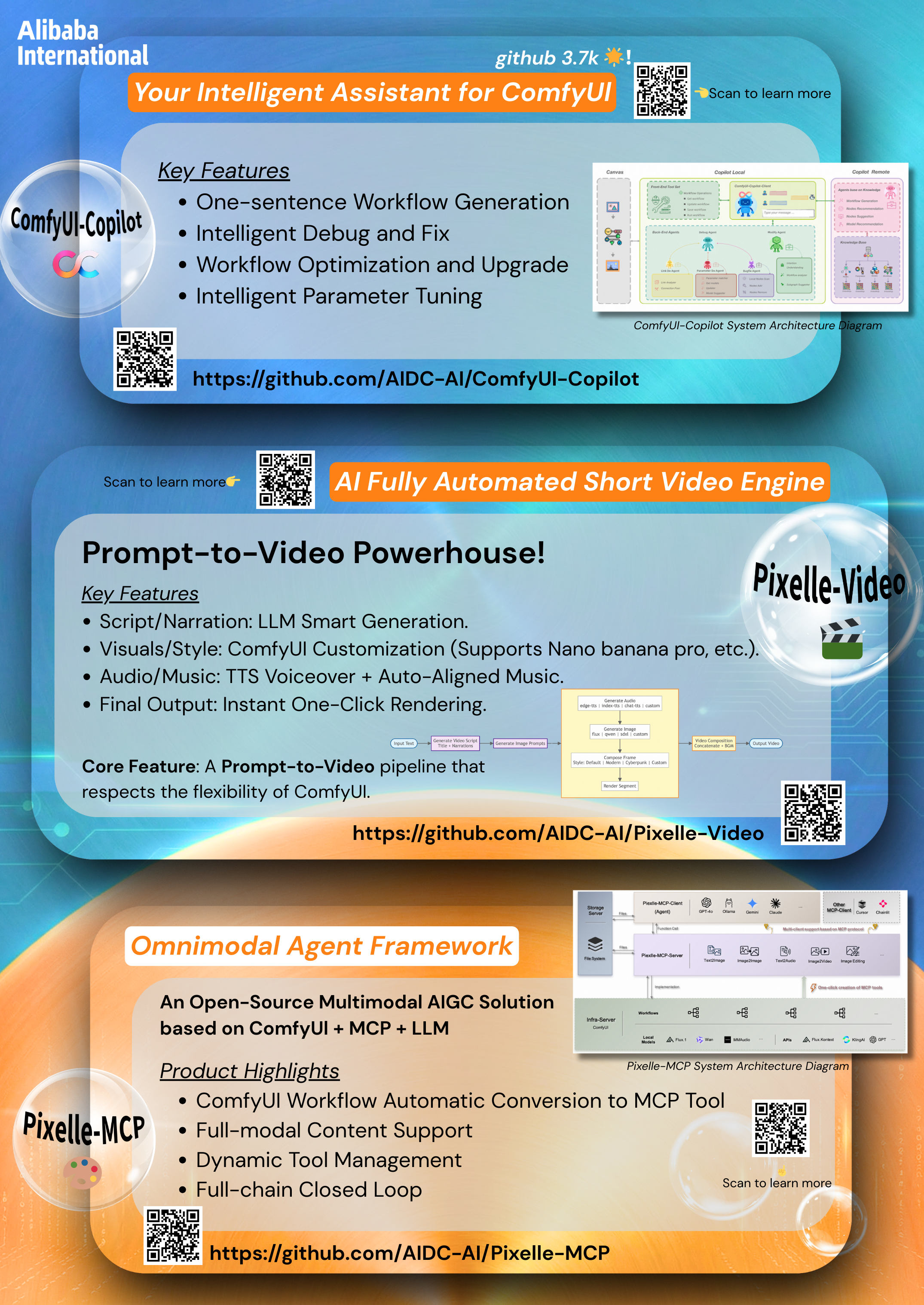 结合 Pixelle 在新加坡线下展会的宣发需求,我为团队设计了这组宣传海报。在工作流中,我将严谨的产品信息架构与前沿的视觉生成技术(Nano Banana Pro)深度结合。这不仅直观呈现了我们端到端的开源工具生态,更是一次将 AI 创造力无缝接入商业交付的绝佳实践。